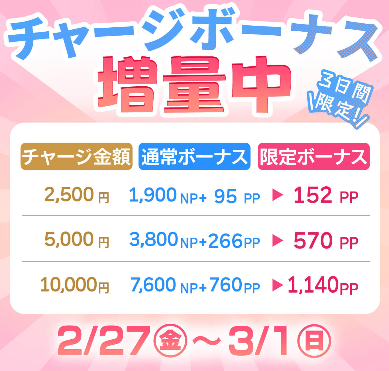 æéäžã察象éé¡ã®NPãã£ãŒãžãè¡ããšããã£ãŒãžéé¡ã«å¿ããŠãéå®ããŒãã¹PPãä»äžããŸãã