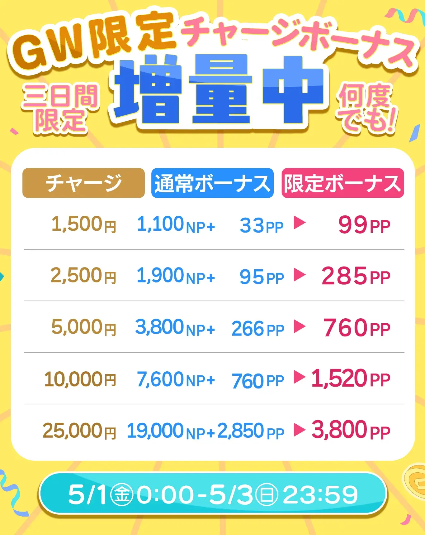 æéäžã察象éé¡ã®NPãã£ãŒãžãè¡ããšããã£ãŒãžéé¡ã«å¿ããŠãéå®ããŒãã¹PPãä»äžããŸãã